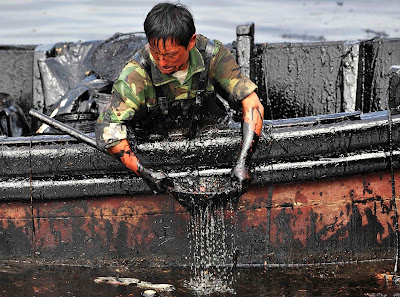 Jiang He/A worker cleans up oil at the oil spill site in the port near Dalian, China on July 23, 2010.